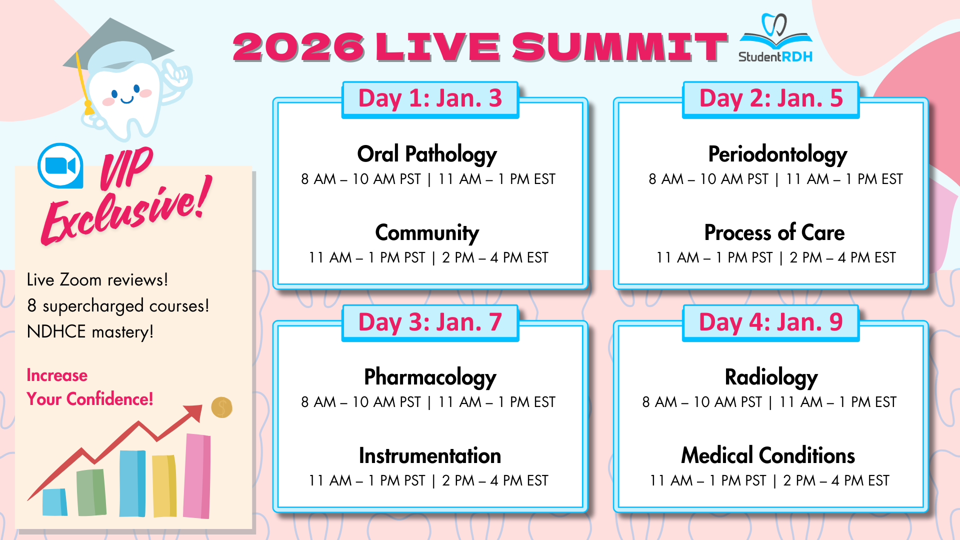 StudentRDH LIVE SUMMIT is a series of 8 webinars, delivered via Zoom.